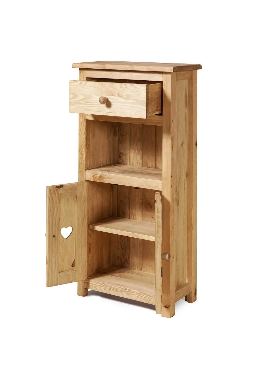 Корпус, ящик, полка и дверцы изготовлены из массива сосны.