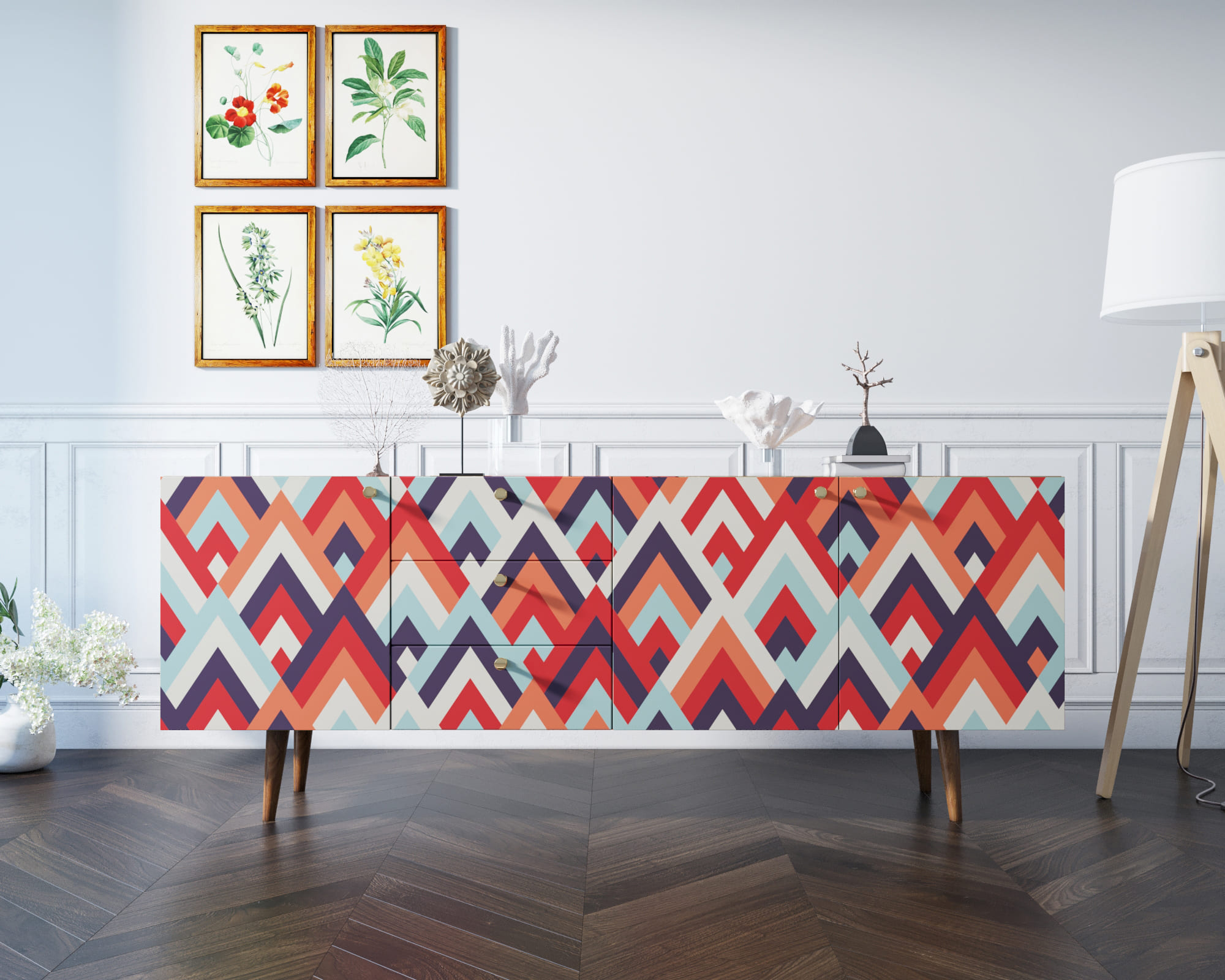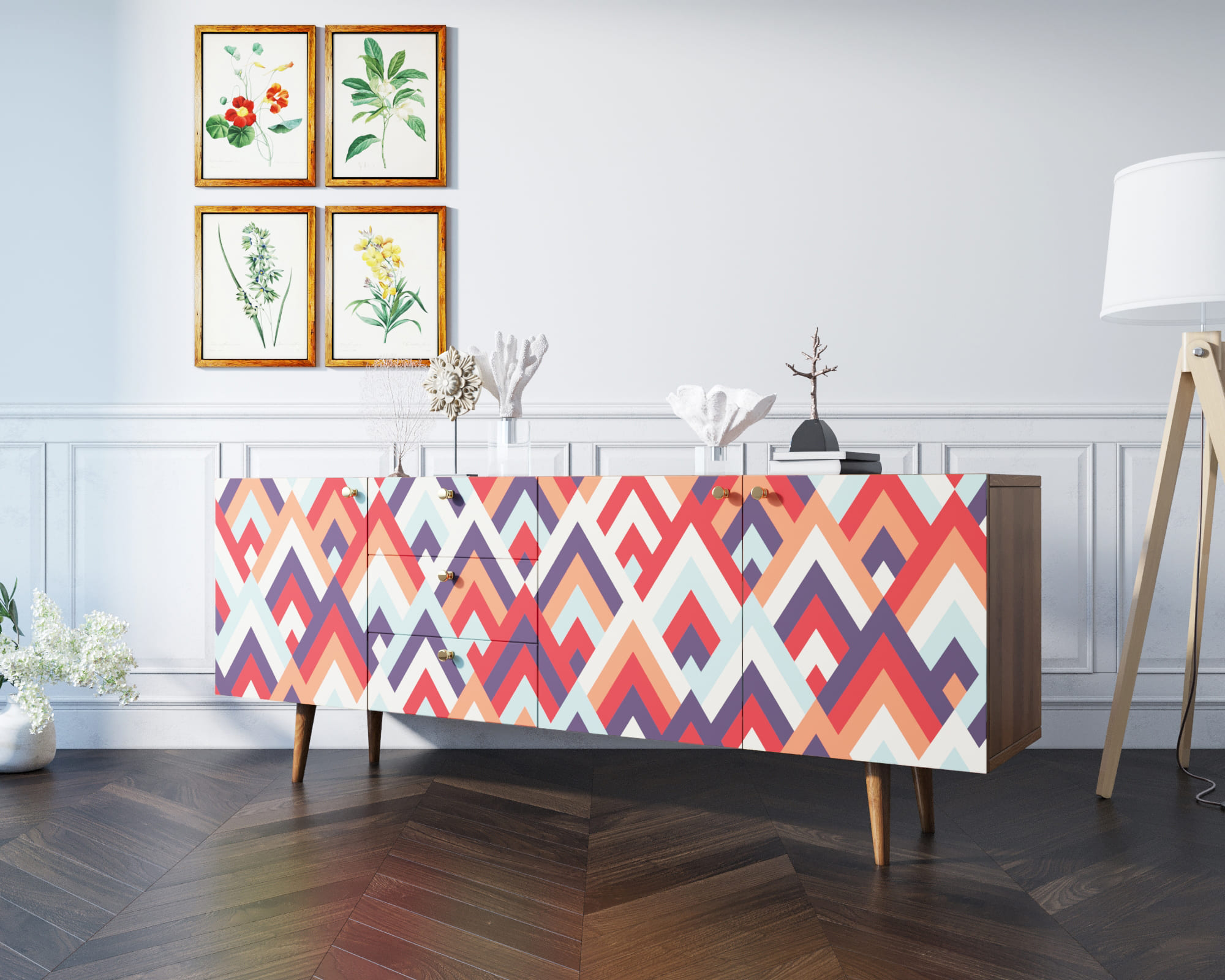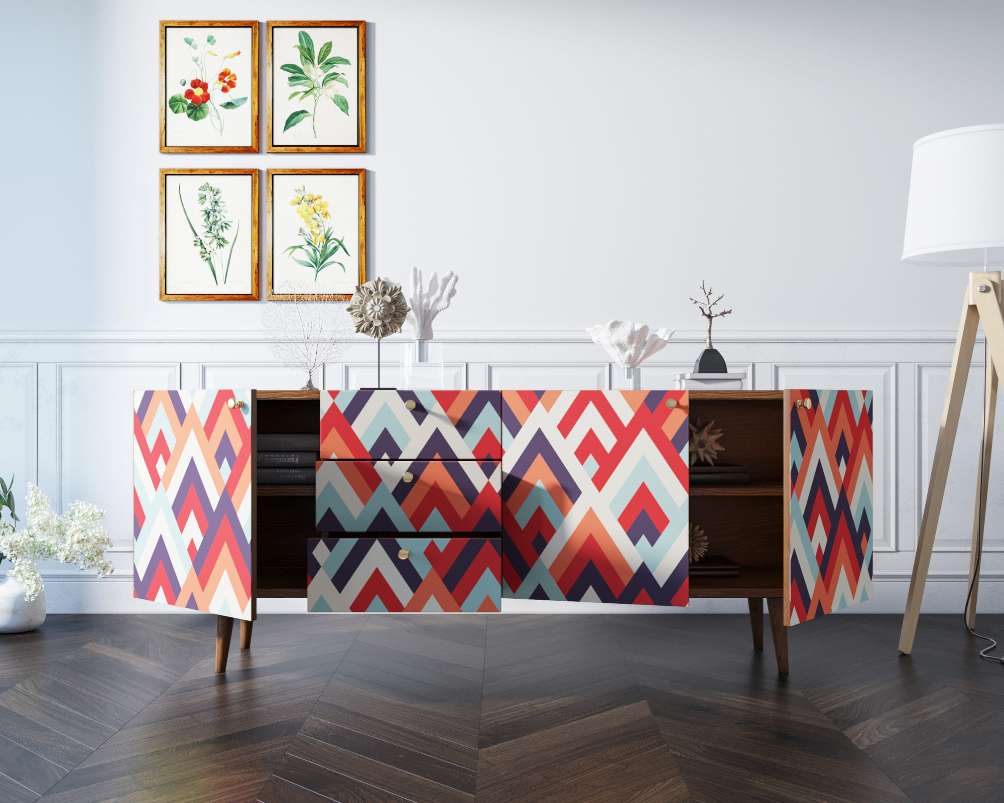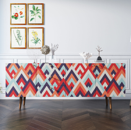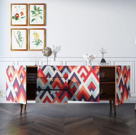 Корпус и фасады изготавливаются из ЛДСП австрийской компании "EGGER". Ножки мы делаем из массива ясеня и крепим на стальную пластину, на дверях петли с доводчиком а на ящиках шариковые направляющие. Принт на фасады наносится принтером специальными УФ - чернилами.