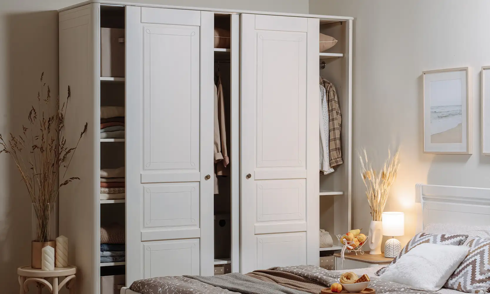 Коллекция «Бетти» – это стильные шкафы, кровати, тумбы, стеллажи, серванты, комоды, тумбы и сундуки для спален, гостиных, прихожих. Для изготовления корпуса и фасадов используется натуральное дерево – массив сосны. Задние стенки и дно ящиков изготавливаются из ДВП.