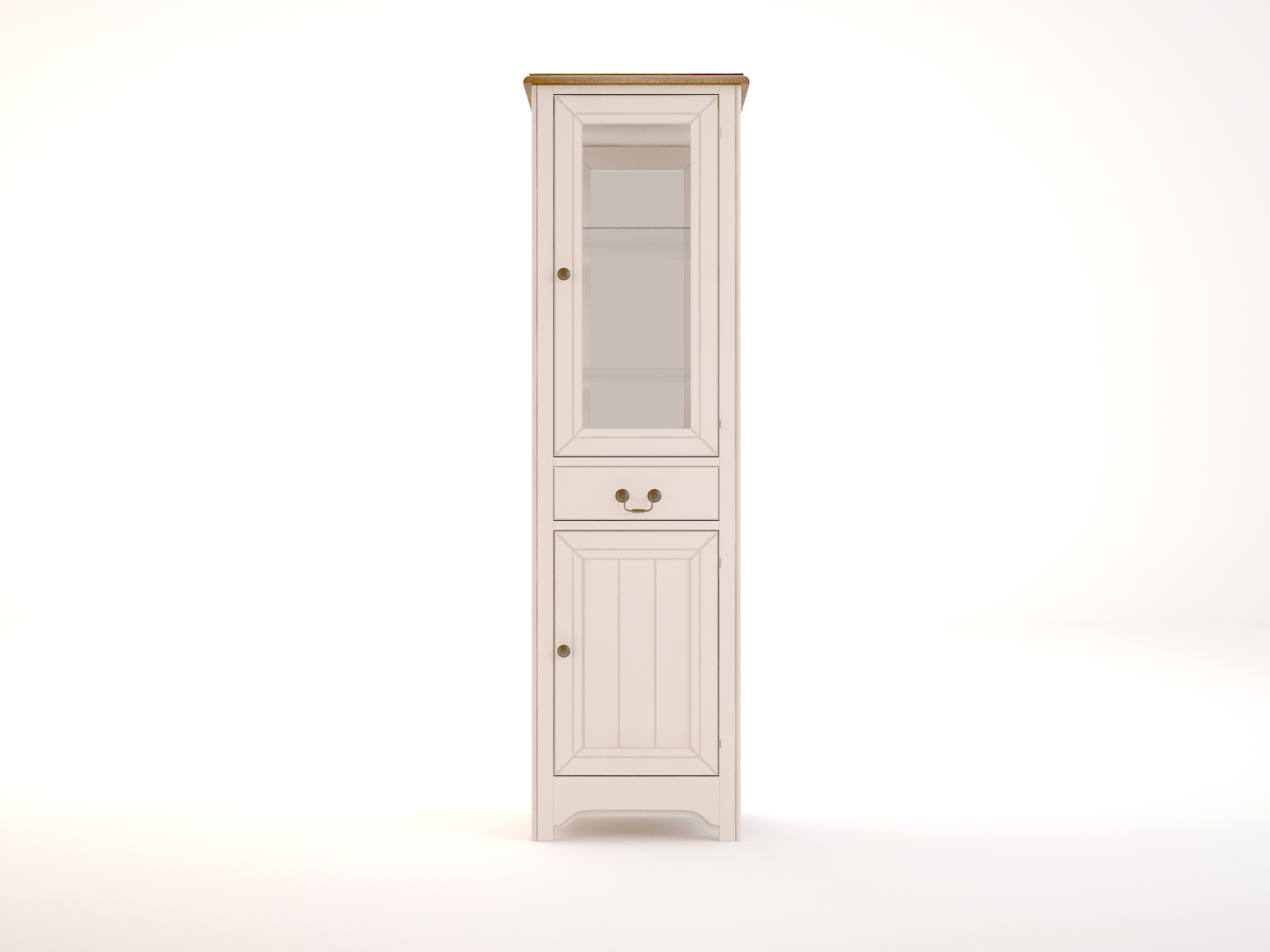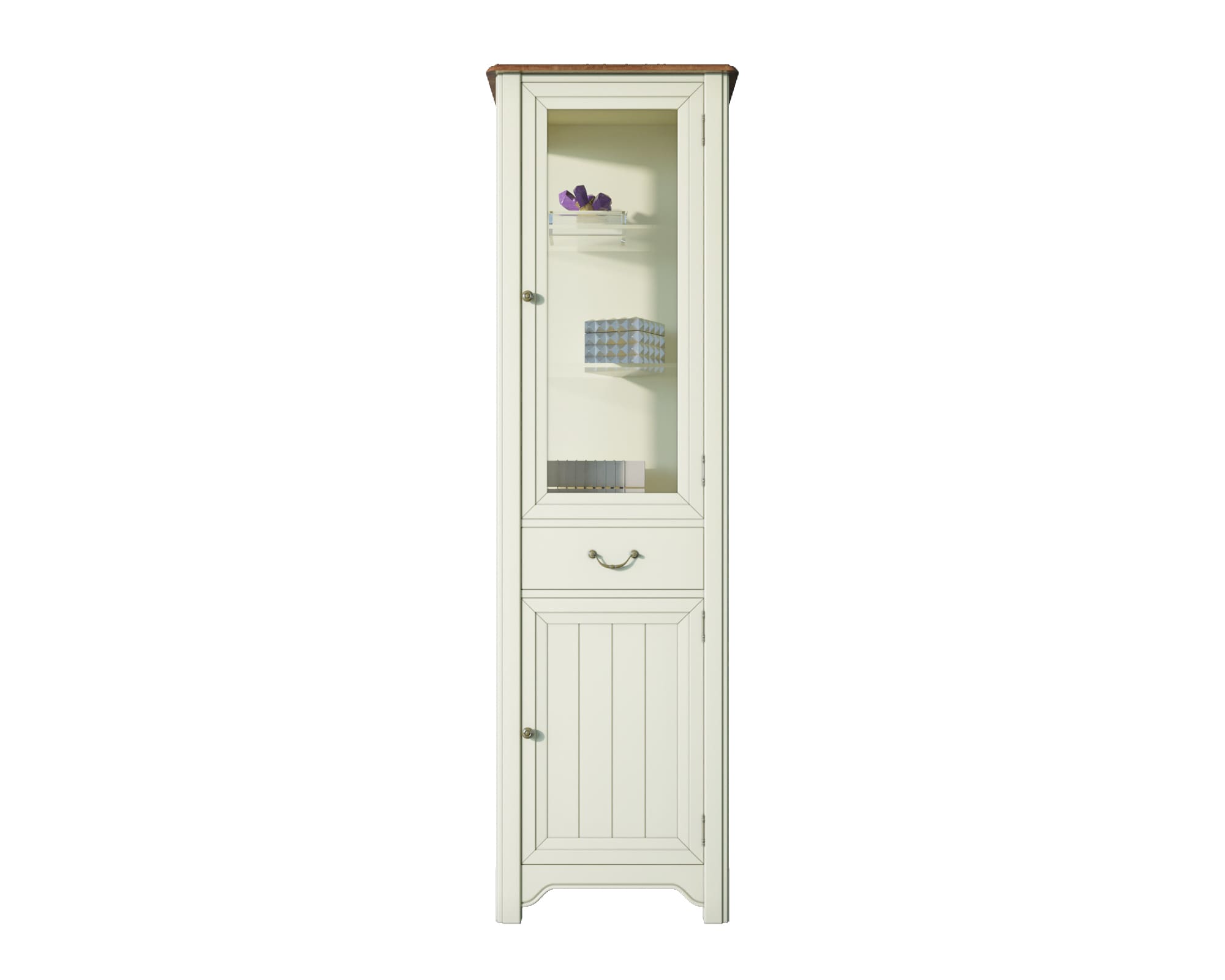 Наполнение: в верхней части шкафа-витрины мы видим распашной стеклянный фасад,