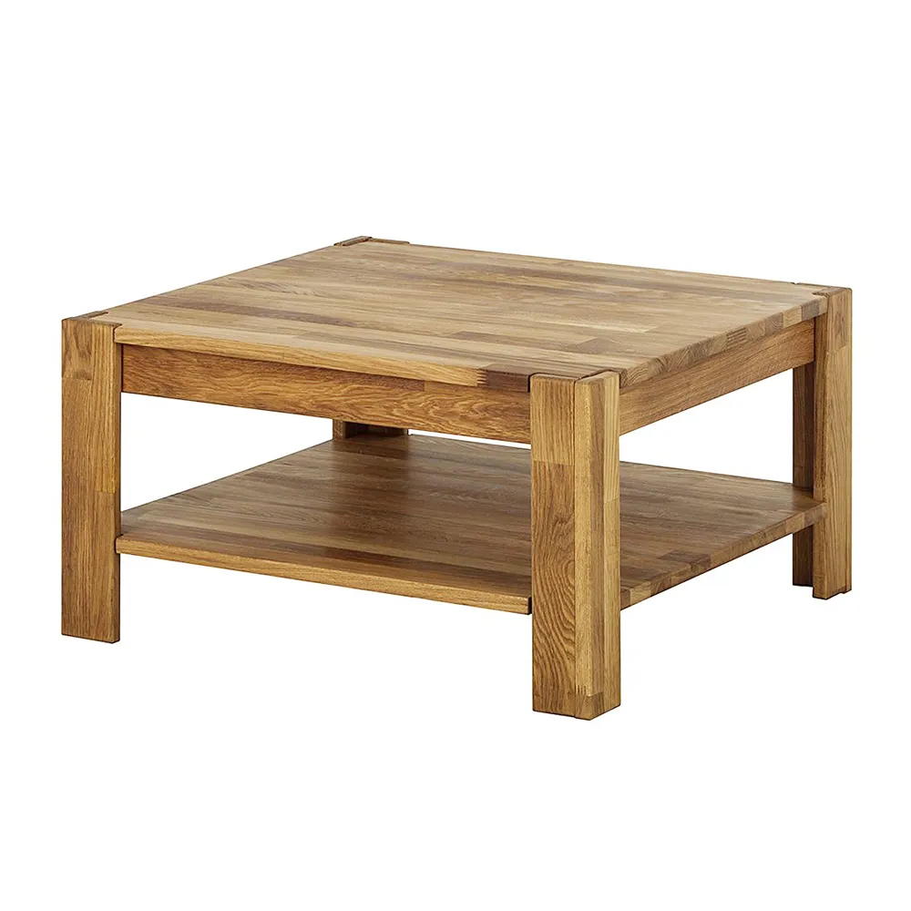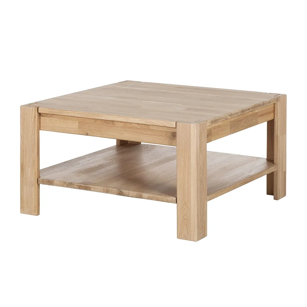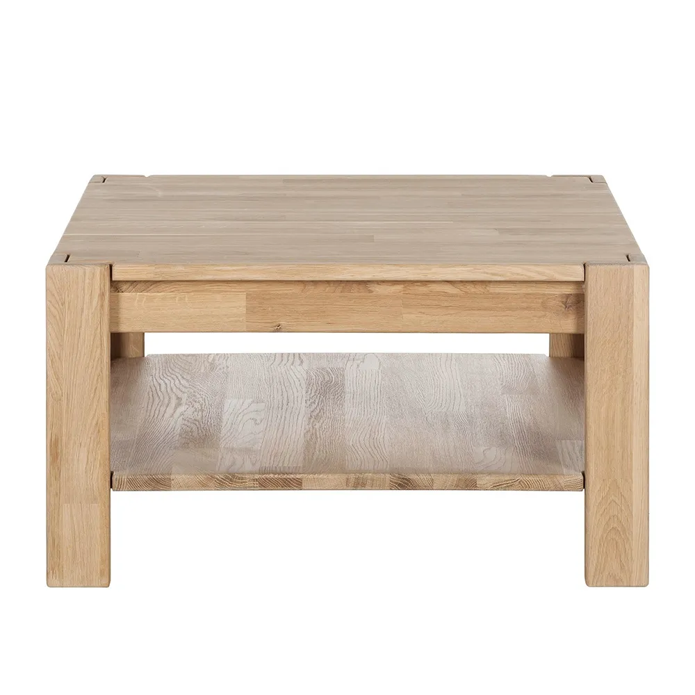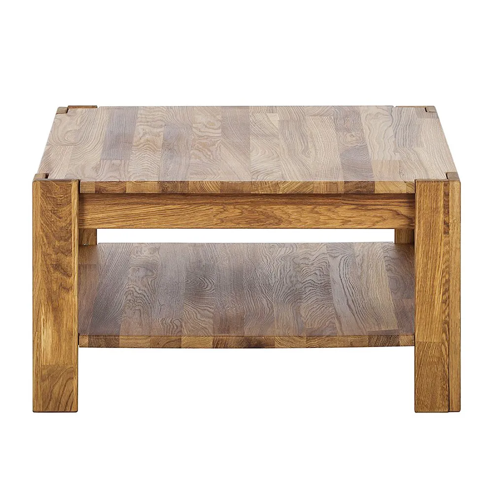 Столик изготовлен из натурального и долговечного материала – массива дуба. Доступно шесть вариантов отделки: бейц-масло, дуб отбеленный, дуб паркетный, дуб венге, тёмная вишня и итальянский орех. Вы можете выбрать тот вариант, который лучше всего подойдёт к вашему интерьеру. Столик имеет массивные прямые ножки, очень устойчивый. Внизу есть полка для книг, журналов или настольных игр. Габариты стола 700х700х380 мм, вес — 20 кг. Гарантия на стол составляет 1 год.
