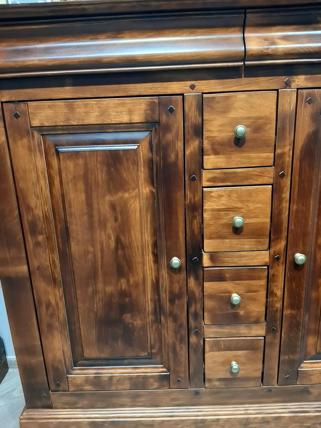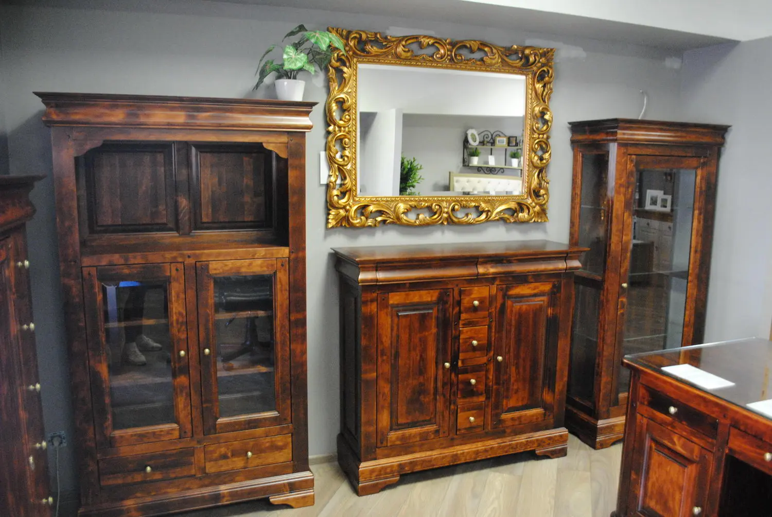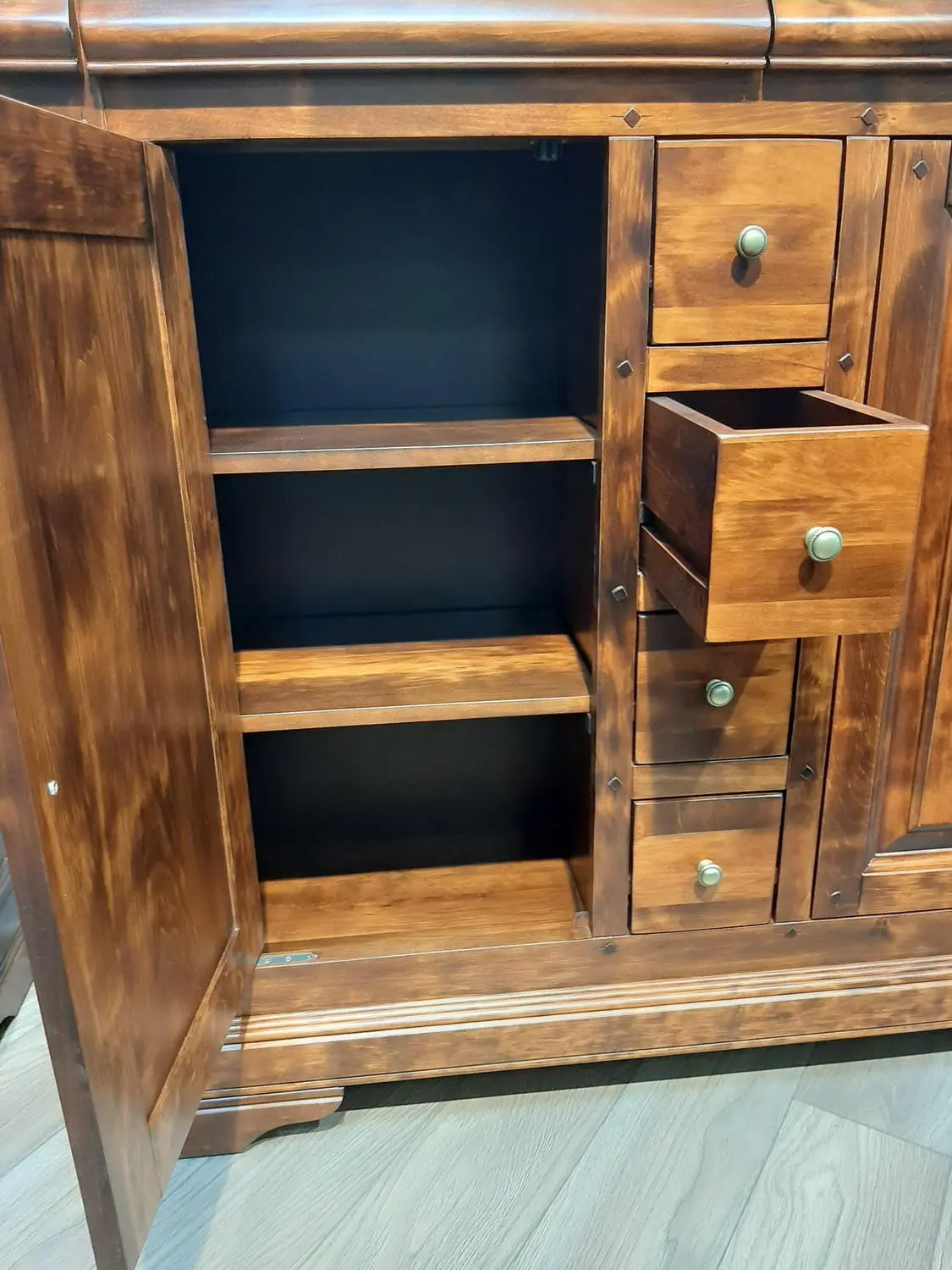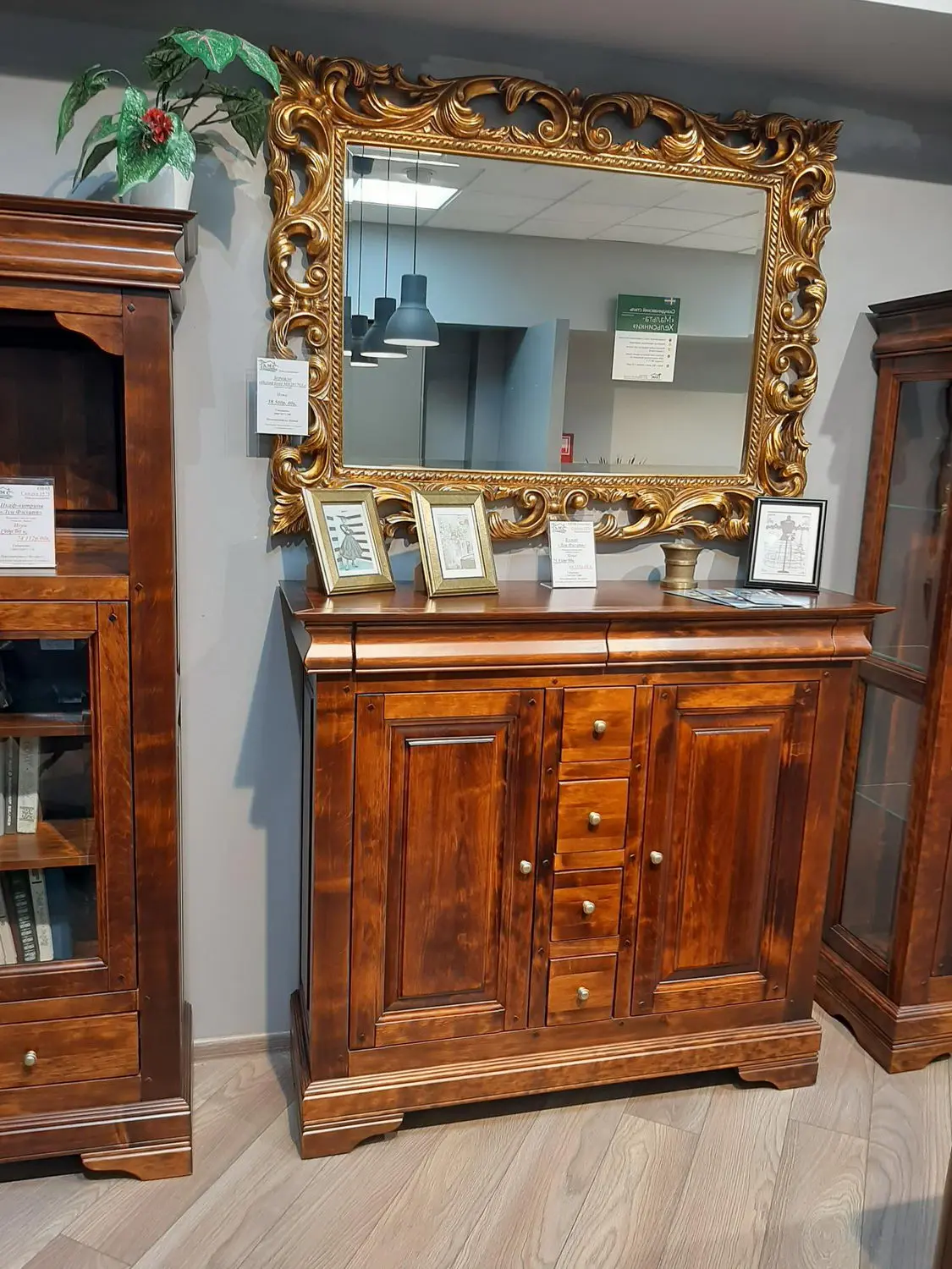 У комода глухие дверцы, за каждой находится отделение с тремя полками. На дверцах устанавливаются ручки или замки с ключами, на выбор. Над каждой дверцей расположен небольшой выдвижной ящик без направляющих. Особенность комода – четыре небольших выдвижных ящика по центру для нужных мелочей. Комод отличается небольшими размерами, подойдет даже для небольших помещений: ширина, глубина и высота 1180х380х1080 мм, вес 73 кг. Поставляется в собранном виде, гарантия на изделие – 1 год. Обратите внимание, что этот комод, как и вся коллекция «Луи Филипп», делается на заказ. Уточняйте срок изготовления у наших продавцов в салонах или по телефону на сайте.