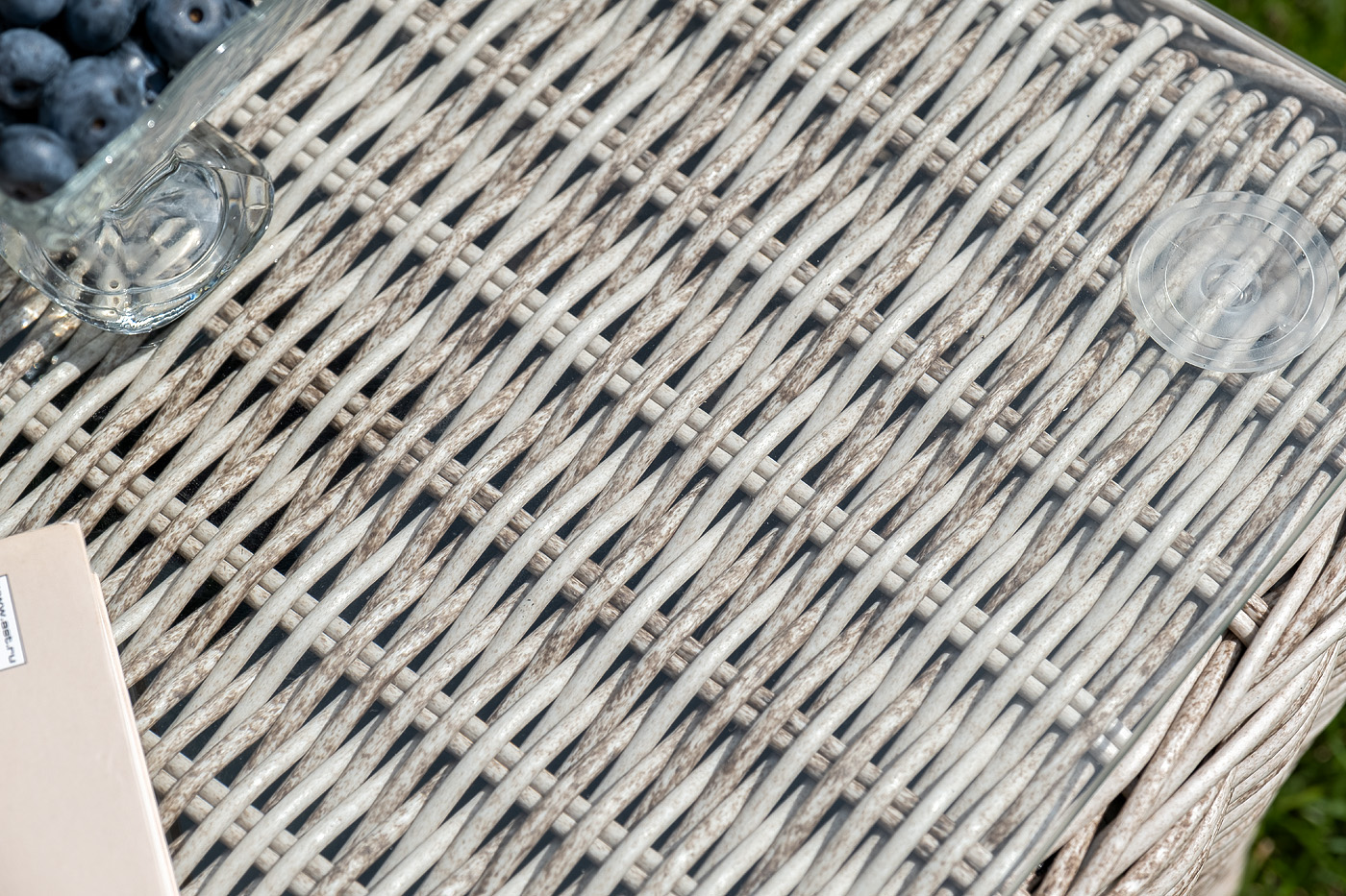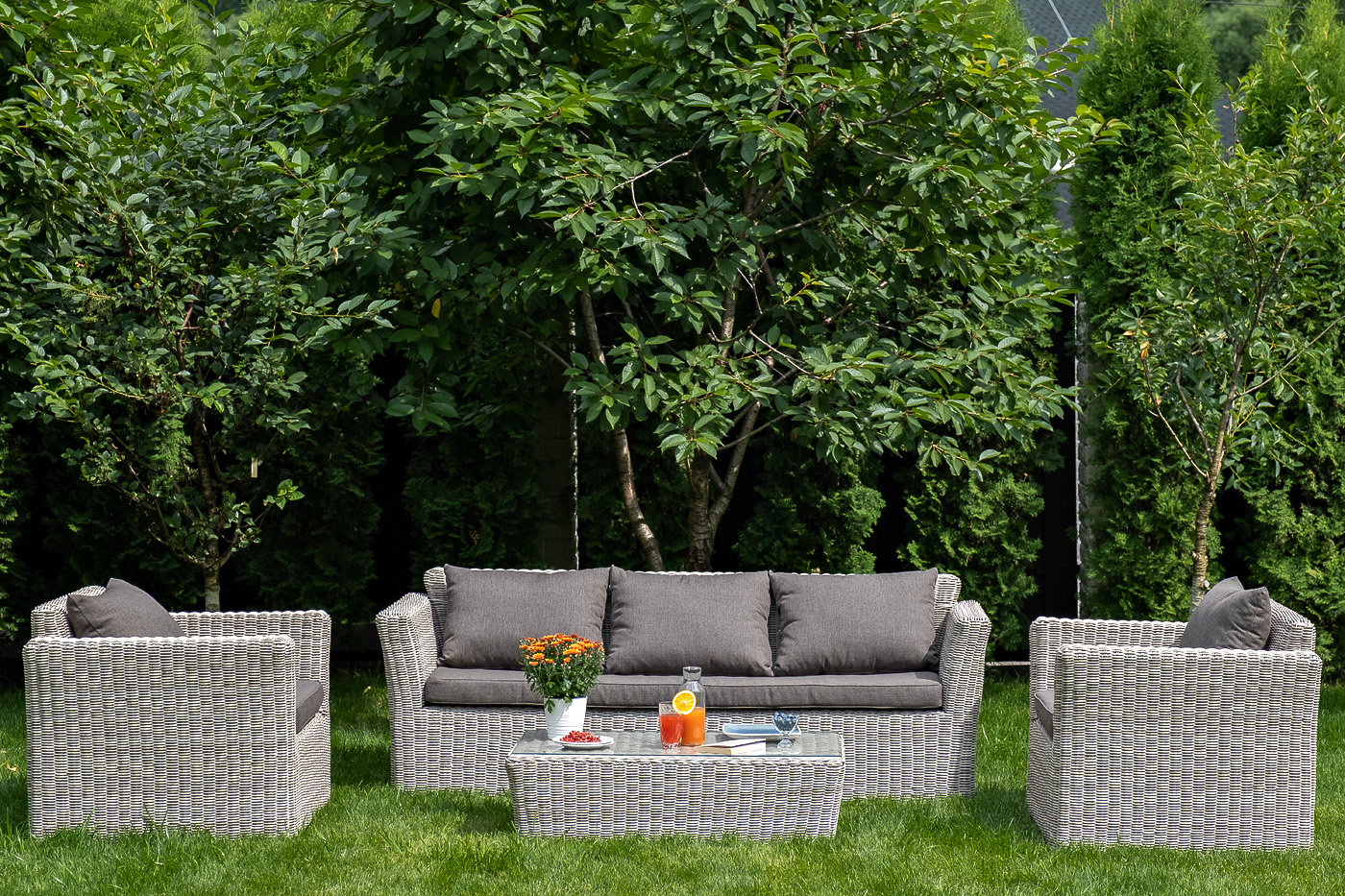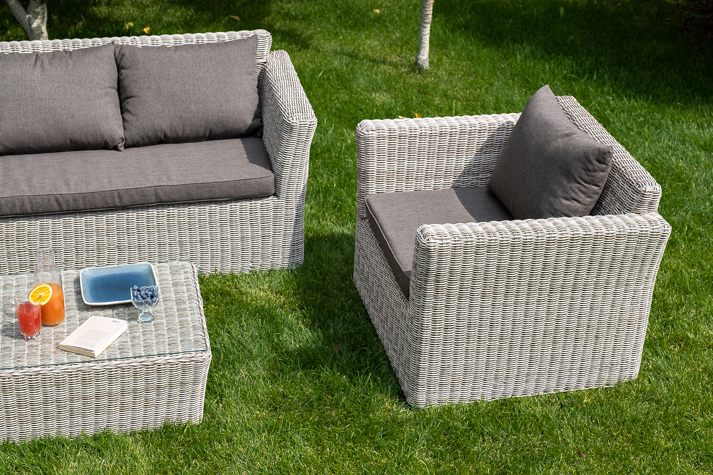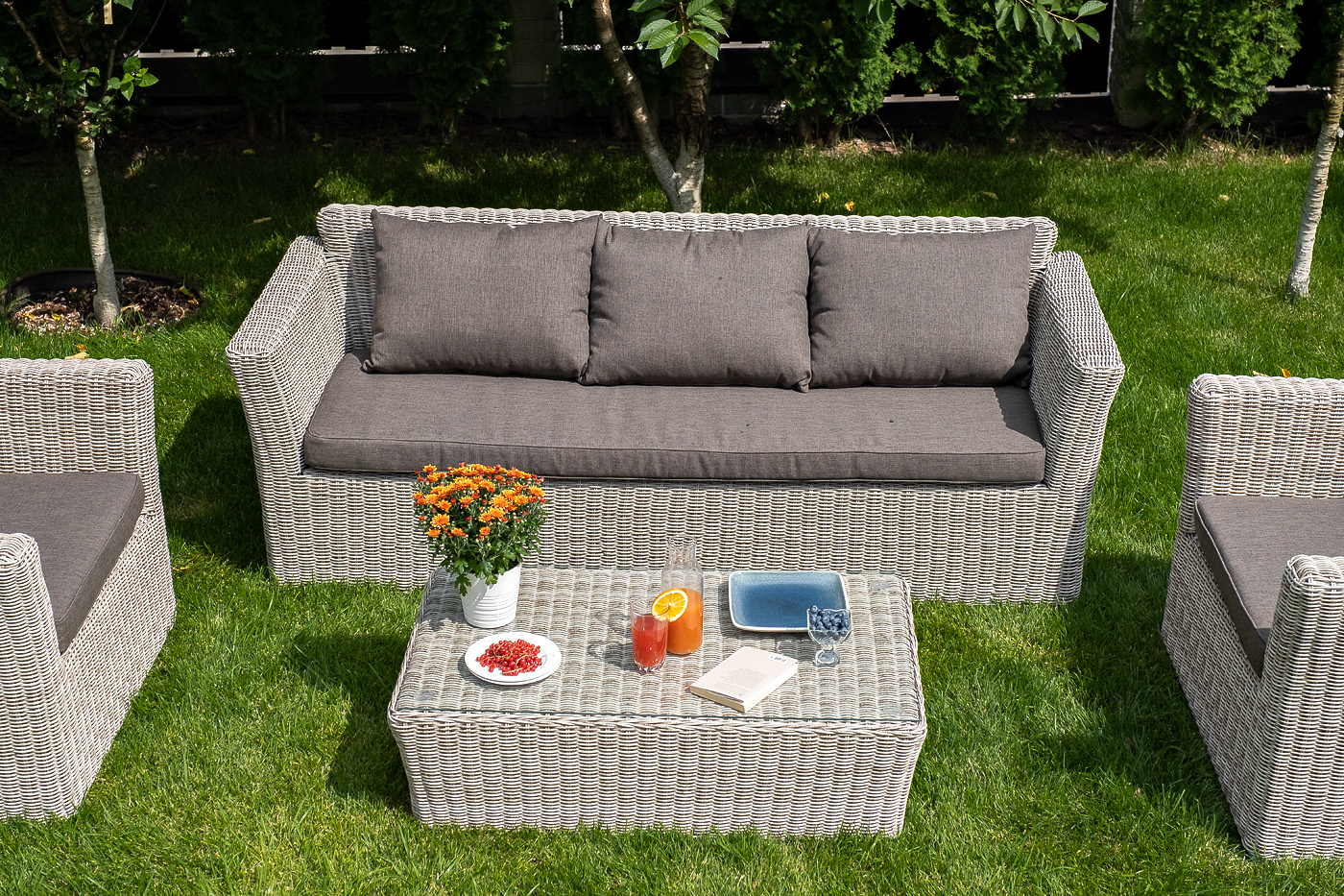 Лаунж-зона "Капуто" отличается хорошей вместительностью, поэтому подходит для комфортного отдыха компании до пяти человек. Комплект состоит из: - двух кресел (размер – 1040×865×815 мм) - журнального столика (размер – 1100×660×340 мм) - трехместного дивана (размер – 2220×865×815 мм). Из алюминия сделан устойчивый каркас мебели. Ее поверхность дополнена искусственным ротангом, из которого сделано ручное плетение, цвет бежевый. Кресла и диван идут в комплекте с подушками с серо-коричневыми чехлами. Они пошиты из качественного полиэстера с плотностью 230гр/м2. Материал предварительно проходит обработку влагоотталкивающей пропиткой. Столик дополнен практичной столешницей из стекла толщиной 5 мм. "Капуто" диван из искусственного ротанга трехместный, цвет бежевый 1шт. 2 220Х865Х815, "Капуто" кресло из искусственного ротанга, цвет бежевый 2шт. 1 040Х865Х815, "Капуто" журнальный столик из искусственного ротанга, цвет бежевый 1шт. 1 100Х660Х340,